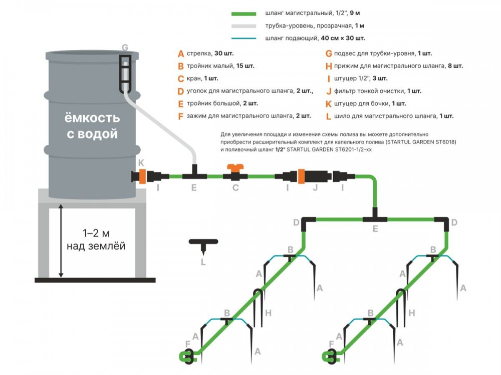 Комплект поставки шланг магистральный, 1/2" (9м.), трубка-уровень, прозрачная (1м.), шланг подающий (40см х 30шт.), стрелка (30шт.), тройник малый (15шт.), кран (1шт.), уголок для магистрального шланга (2шт.), тройник большой (2шт.), зажим для магистрального шланга (2шт.), подвес для трубки-уровня (1шт.), прижим для магистрального шланга (8шт.), штуцер 1/2" (3шт.), фильтр тонкой очистки (1шт.), штуцер для бочки (1шт.), шило для магистрального шланга (1шт.), руководство по эксплуатации