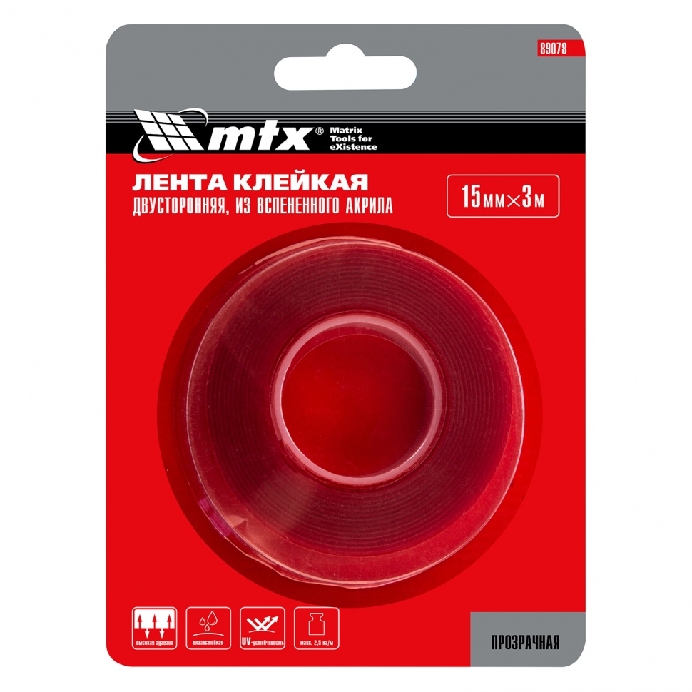 Двусторонняя клейкая лента из вспененного акрила Matrix 89078 размером 15 мм х 3 м, прозрачная, обеспечивает долговременное соединение предметов из стекла, металла и пластика, в том числе предметов, подверженных вибрационным и ударным нагрузкам. Подходит для скрепления прозрачных материалов и особенно актуальна в случаях, когда необходима невидимая линия соединения. Лента обладает повышенной мягкостью и гибкостью, используется при ремонтных работах в гараже, дома или на даче.