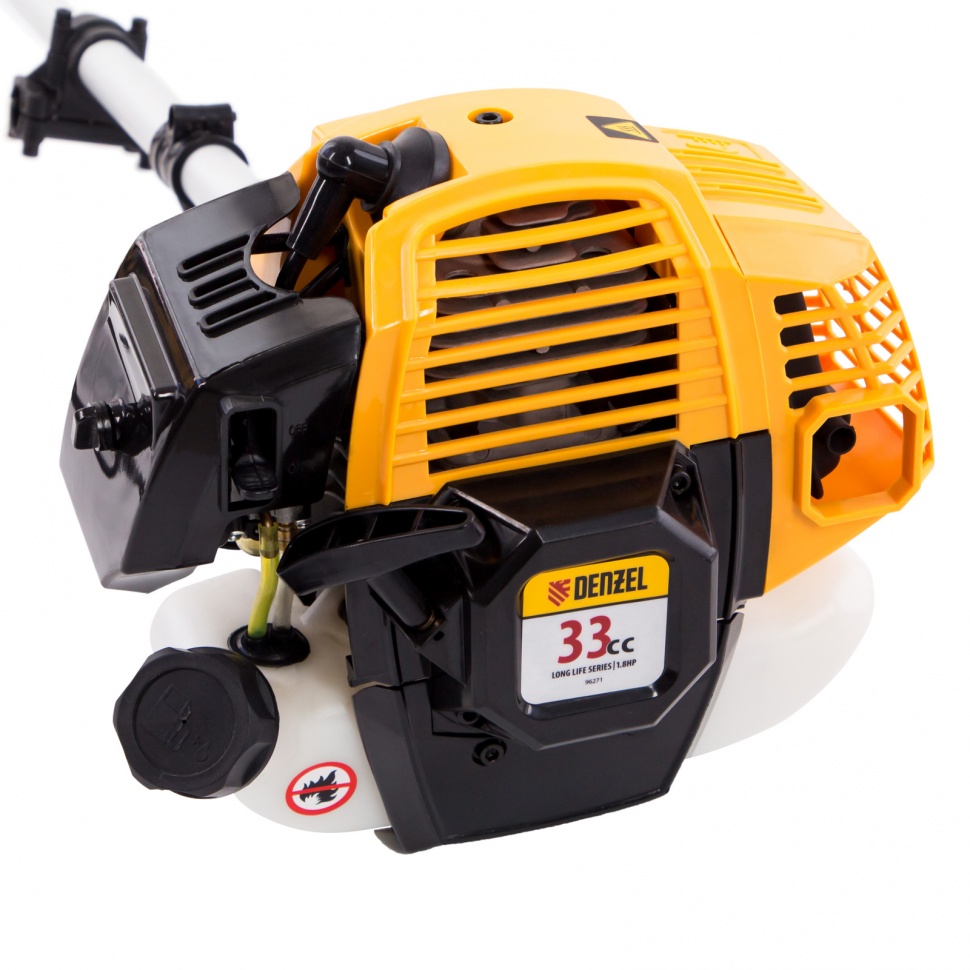 Бензиновый триммер Denzel DR-33 подходит для: стрижки редкой, густой и свалявшейся травы, скашивания молодого кустарника, удаления сорняков, точной обработки границ газона. Скашивание производится с помощью трехлопастного стального ножа и усиленной полиамидной катушки с леской. Оснастка вращается со скоростью 9500 об/мин, и обеспечивает ширину скашивания 25,5 см и 42 см.