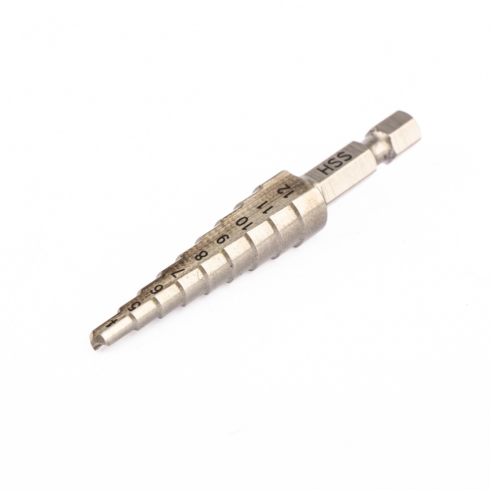 Ступенчатое сверло по металлу Барс 72360 из стали P6M5, с шестигранным хвостовиком, используют для получения в металлических заготовках отверстий диаметром 4-5-6-7-8-9-10-11-12 мм. Благодаря своей конструкции заменяет целый набор традиционных спиральных сверл. Оснастка позволяет снять фаску во время сверления, получив отверстие с ровными краями под гайку или болт. Сверло будет полезно для выполнения монтажно-сборочных работ.