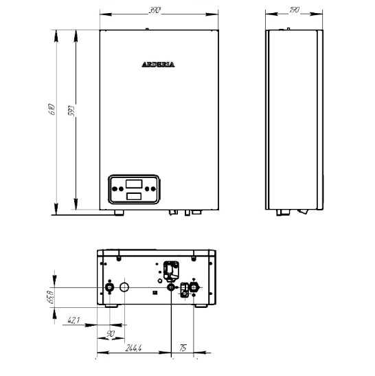 Котлы Arderia сочетают в себе экономичность, высокое качество и надежность. При своих минимальных габаритах, котёл включает в себя: бак, трёхскоростной циркуляционный насос, группу гидравлической безопасности, кран подпитки и электронное управление с самодиагностикой. Это мини-котельная полного комплекта.
