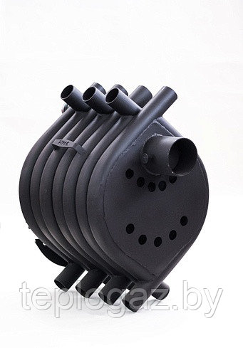 За счет использования сплошного ряда теплообменных труб в боковых стенках увеличена поверхность теплоотдачи и решена проблема интенсивного инфракрасного излучения при номинальной мощности эксплуатации печи. Холодный воздух, из отапливаемого помещения, за счет конвекции поступает в нижние отверстия теплообменных труб, а через верхние возвращается в помещение нагретым до температуры от 60 до 80 градусов.Таким образом, воздух равномерно нагревается и перемешивается по всему объему помещения. Печь имеет двухкамерную топку, в которой методом тлеющего горения в две стадии происходит сжигание топлива и дожиг печных газов. Печные газы, образовавшиеся от тления дров в нижней (первичной) камере поступают в верхнюю (вторичную) камеру, где дожигаются за счет подачи в нее, через специальные инжекторы подогретого воздуха из отапливаемого помещения.