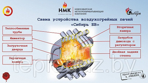Воздухогрейная печь " Сибирь БВ" - 120 - это инновационная запатентованная модель завода " НМК" . Печь представляет собой цельнометаллическую конструкцию, состоящую из многочисленных соединенных между собой металлических труб круглого сечения в количестве 7 штук, обеспечивающую естественную конвекцию, благодаря чему происходит быстрое нагревание воздуха и его плавное распределение по всему объему помещения. За основу был взят канадский отопительный аналог, который был технически и конструкционно доработан, проверен и адаптирован под суровые условия со значительными перепадами среднегодовых температур.