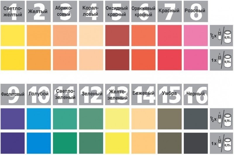 Применяются для колеровки любых эмалей на основе искусственных, алкидных, эпоксидных и полимеризационных смол, нитроэмалей, для хлоркаучуковых, комбинированных, акриловых и водно-дисперсионных эмалей, для колеровки лессировок, пропиток, морилок, воска для древесины, а также для колеровки известковых, дисперсионных, эмульсионных и латексных красок, штукатурок и шпатлевок на основе искусственных смол. Применение невозможно или ограничено для дисперсий и фасадных красок на основе плиолитов или других полимеризационных смол, содержащих растворители, для эластичных красок и материалов, полиэфирных и полиуретановых одно- и двухкомпонентных эмалей, силикатных и силиконовых красок.